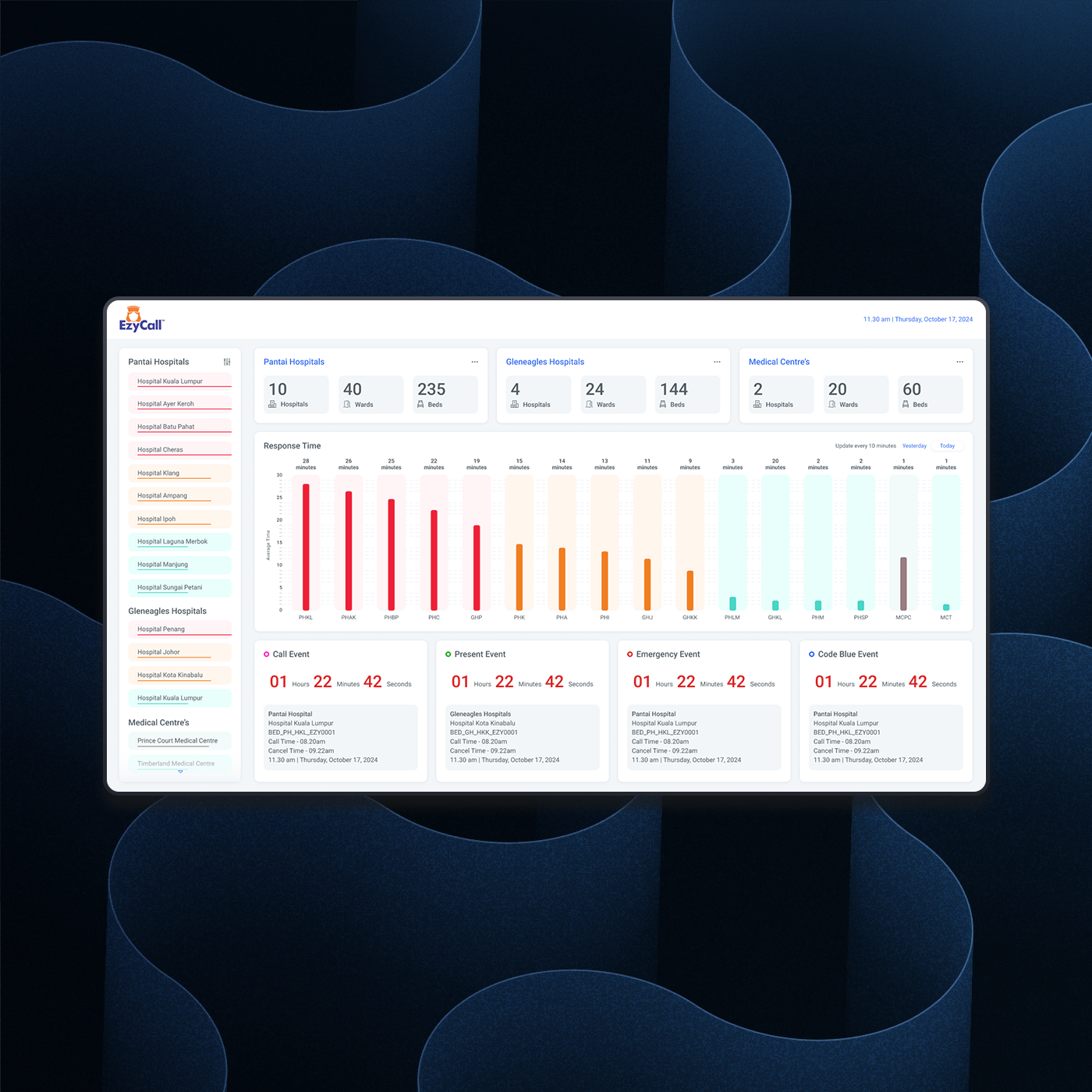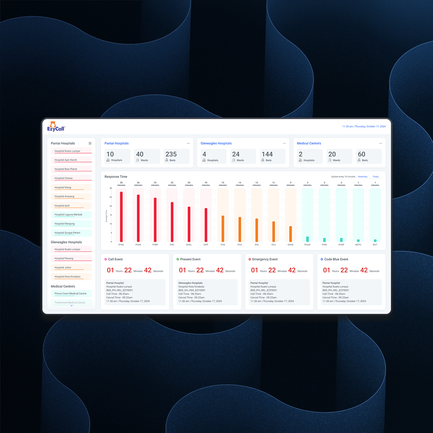The EzyCall System is a hospital management tool that tracks and monitors doctor response times to patient calls and requests. It provides real-time data, automated alerts, and detailed reports to improve response efficiency, ensure timely care, and enhance patient satisfaction.